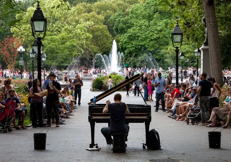 在washinton square长凳静静坐着看表演