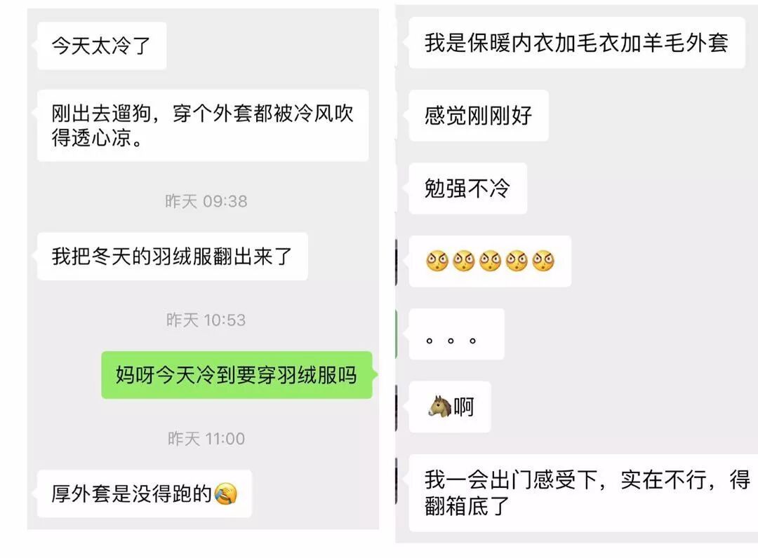 从上周末开始,好不容易暖和了几天的纽约又迎来新一轮降温。本周周一周二的两天大暴雨和骤降到几度的天气,硬是让大家纷纷把已经压箱底的羽绒服拿出来抵御寒冷。看看我们群里的小伙伴儿们怎么吐槽天气吧。
